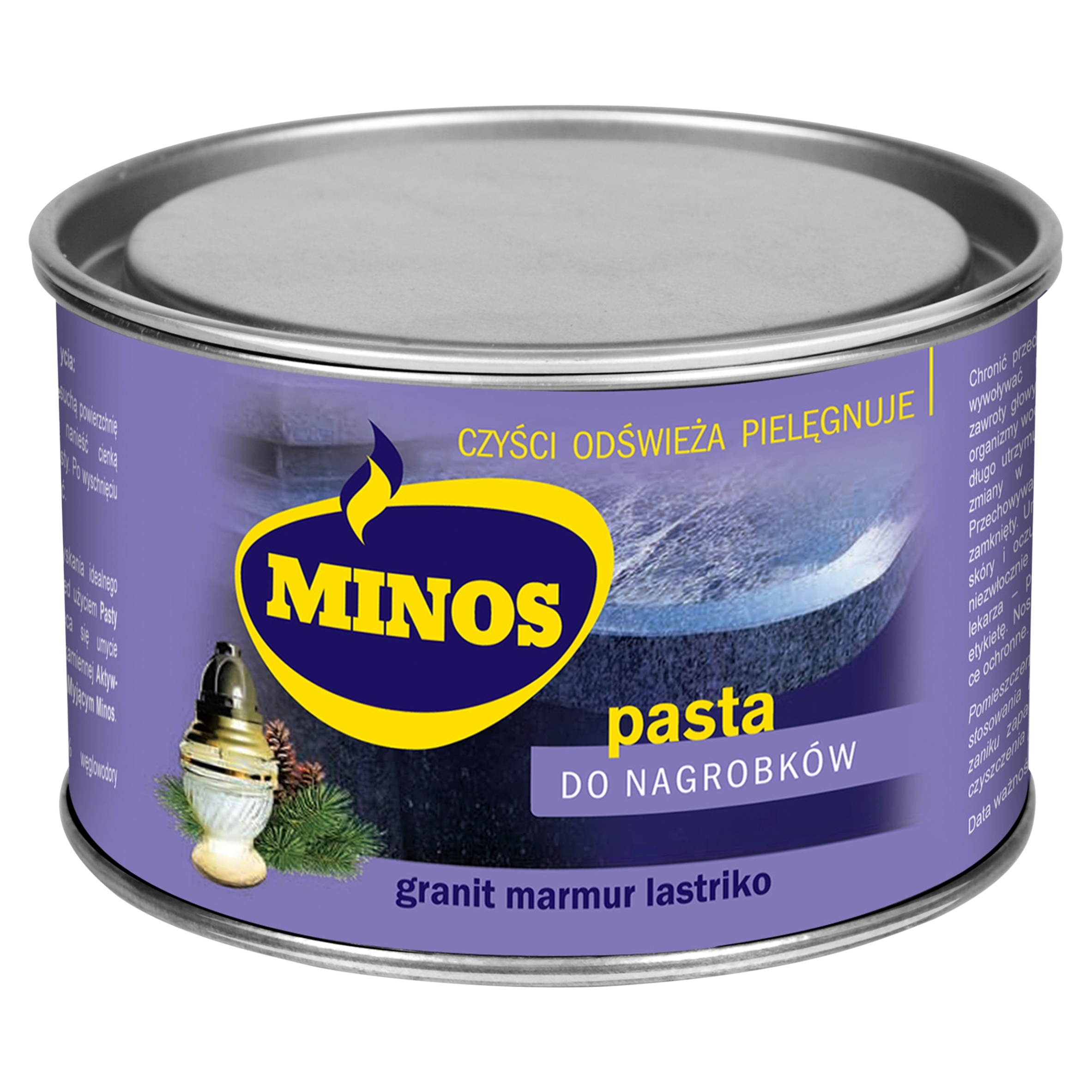 MINOS Pasta 240 g do mycia i konserwacji nagrobków oraz powierzchni z kamienia polerowanego, lastriko, granitu, marmuru itp. nadaje lustrzany połysk czyszczonym powierzchniom, tworzy warstwę konserwacyjną, chroniąc przed wilgocią i wodą. Pasty do polerowania Minos są łatwe w użyciu, tworzą warstwę konserwacyjną, zapobiegająca osiadaniu kurzu i brudu. Preparaty zabezpieczają kamień przed zmianą barwy.