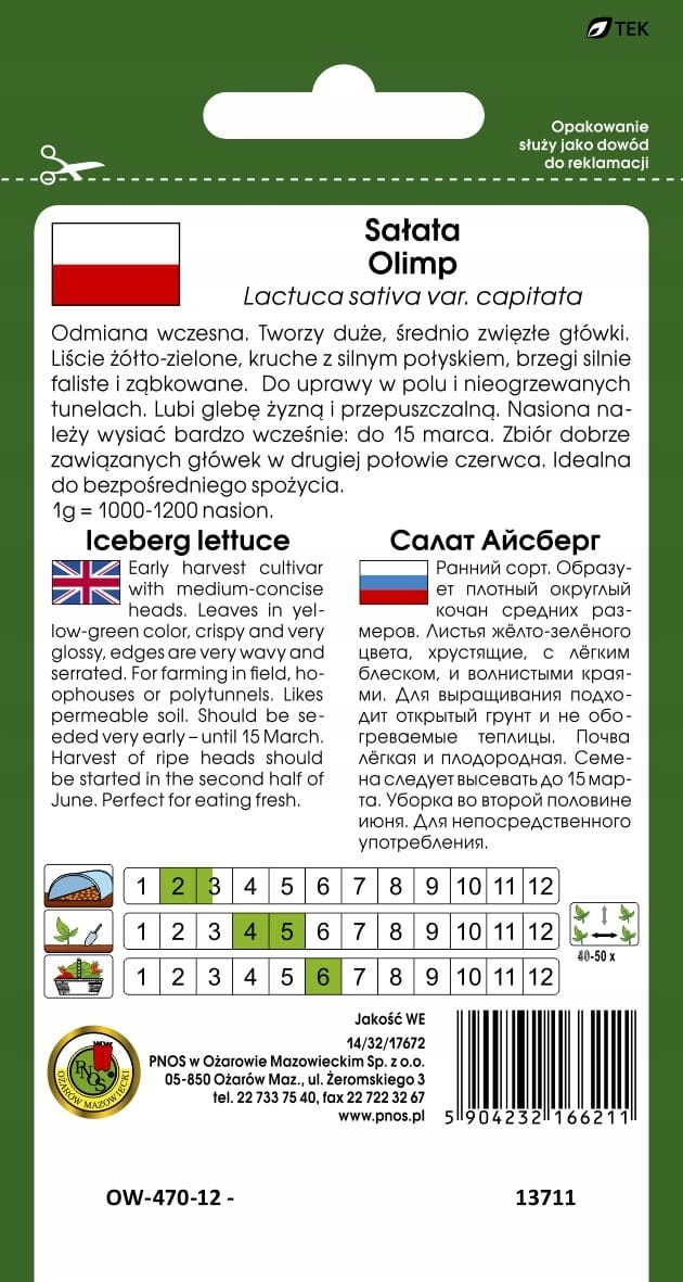 Nasiona Sałata lodowa Olimp 1g sałata głąbiasta krucha PNOS