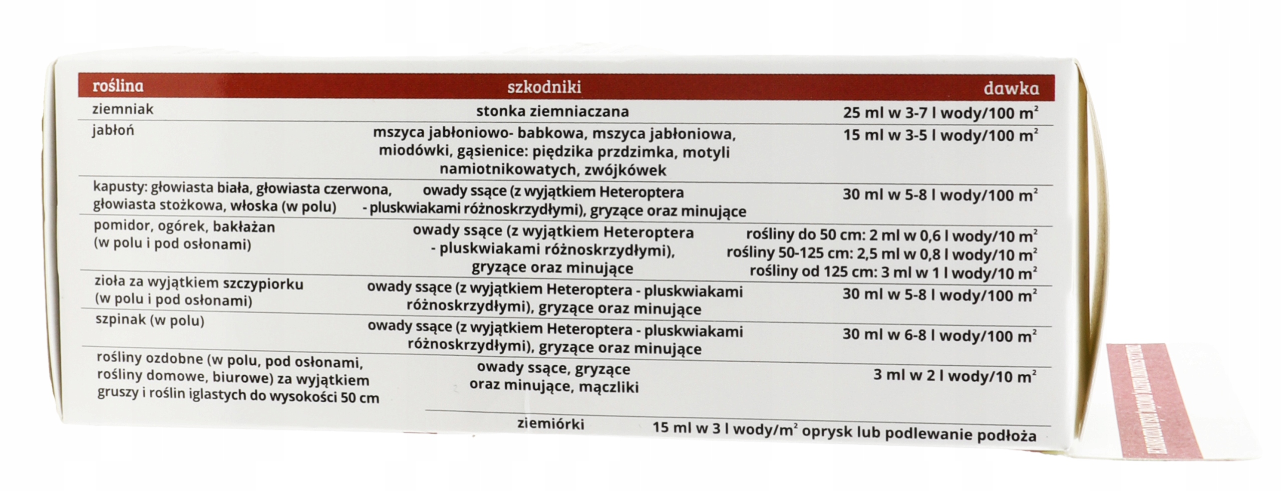 - owady ssące, gryzące oraz minujące – 30 ml preparatu rozpuścić w 5-8 litrach wody, co wystarczy do opryskania 100 m2 powierzchni upraw