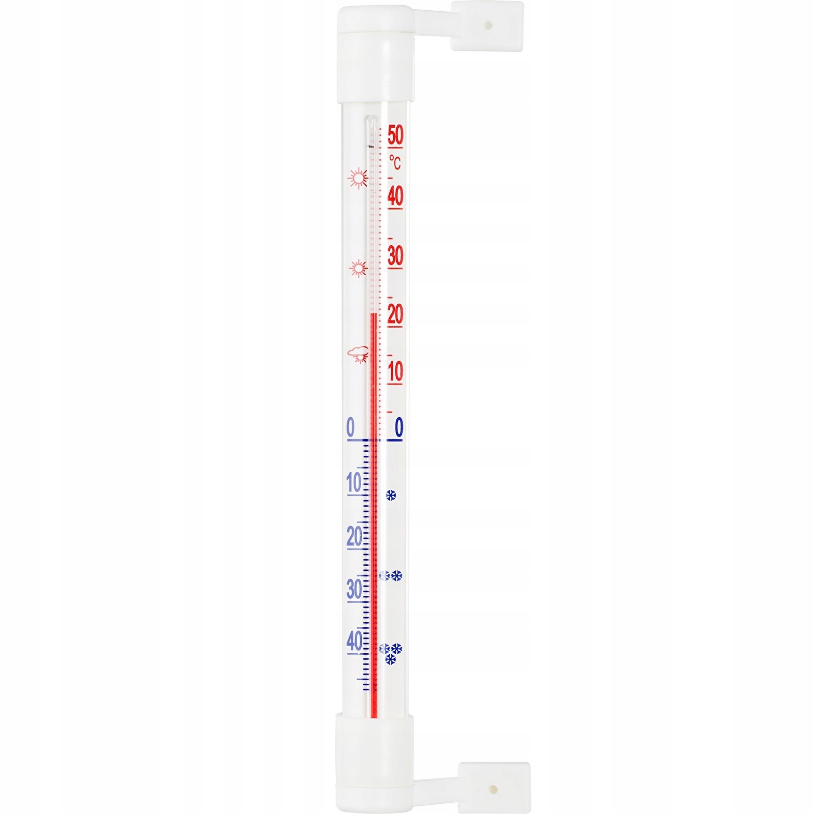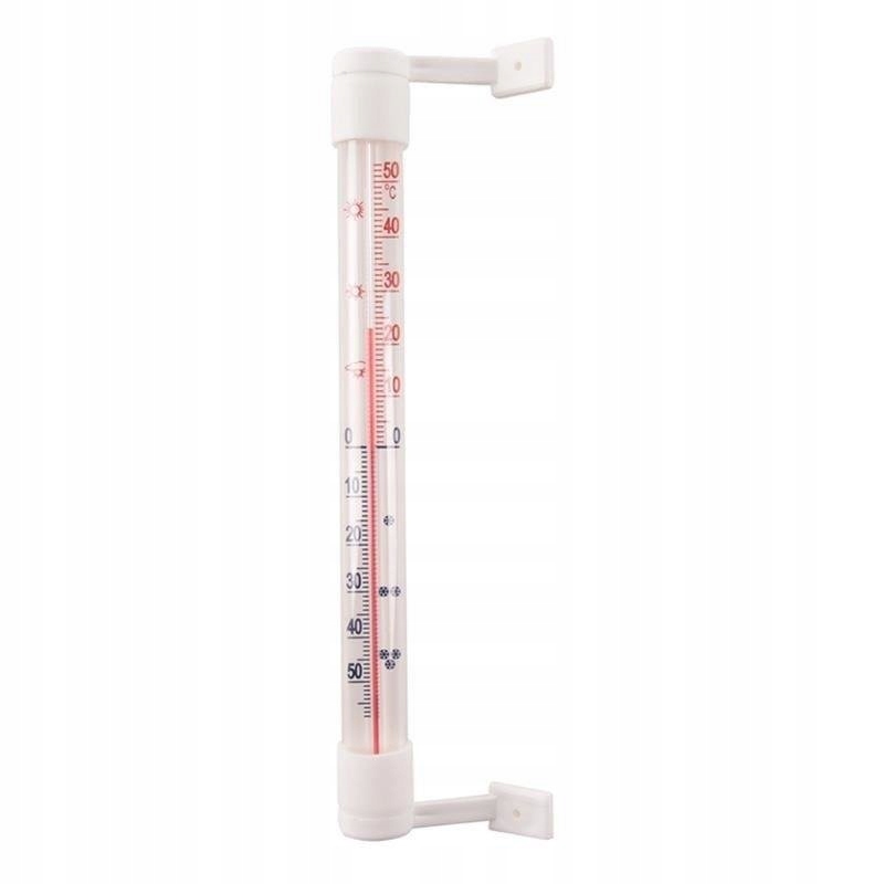 Termometr zaokienny, przykręcany. Skala termometru nadrukowana jest na tekturowej podkładce, umieszczonej w szklanej rurce, z dwóch stron zakończonej plastikowymi korkami. Zakres pomiarowy urządzenia od – 50°C do + 50°C.