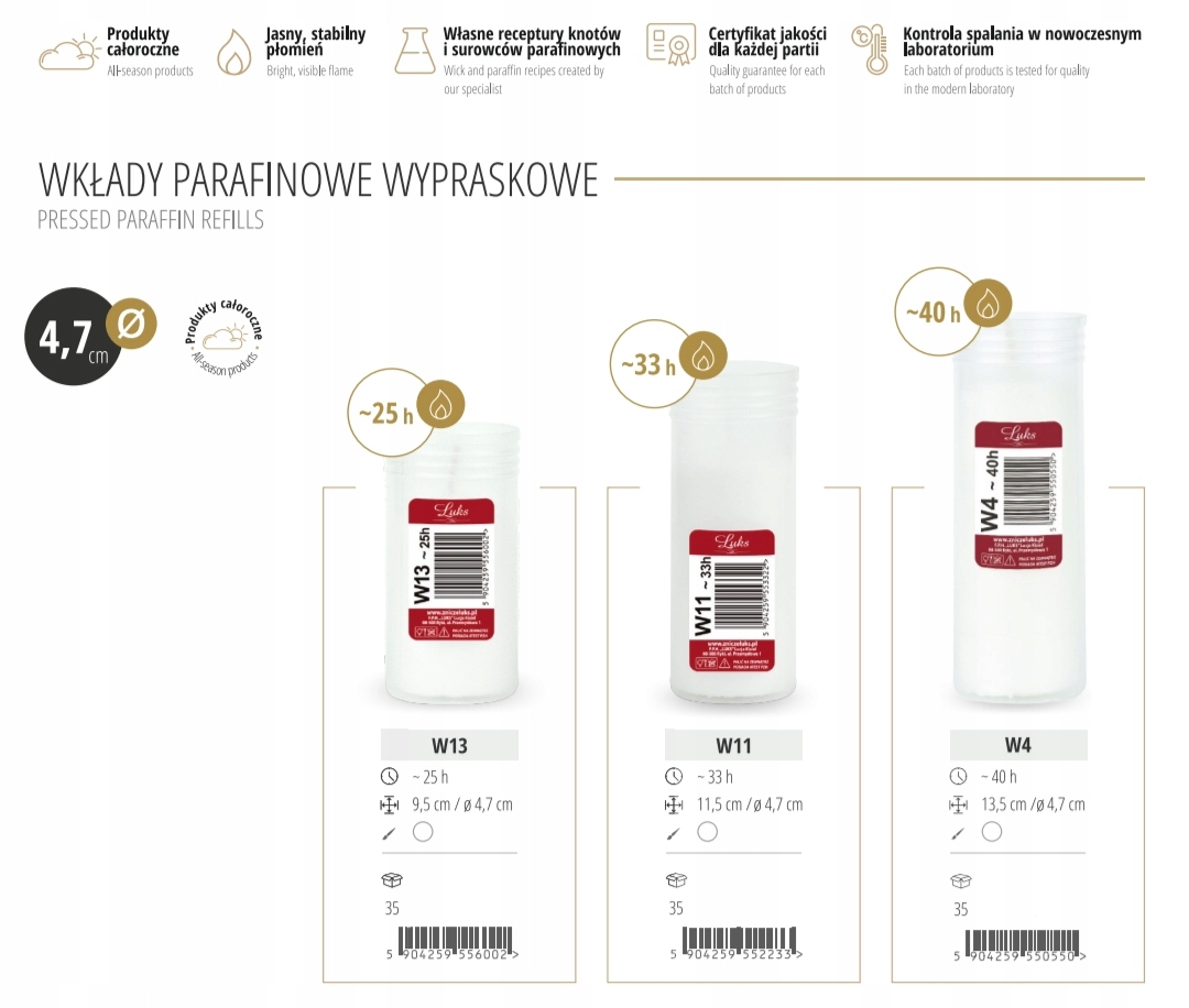 Wkłady parafinowe wypraskowe od firmy LUKS występują w wielu opcjach wymiarowych oraz gramaturowych, aby umożliwić optymalne dopasowanie wkładu do lampionu. Czas palenia wkładu jest uzależniony od gramatury wypraski i oscyluje w przedziale od 15 do 120 godzin.